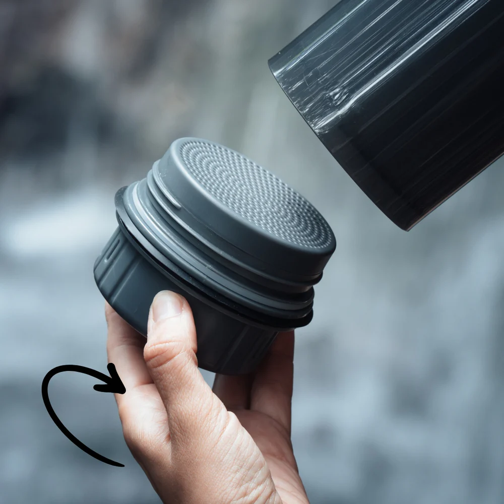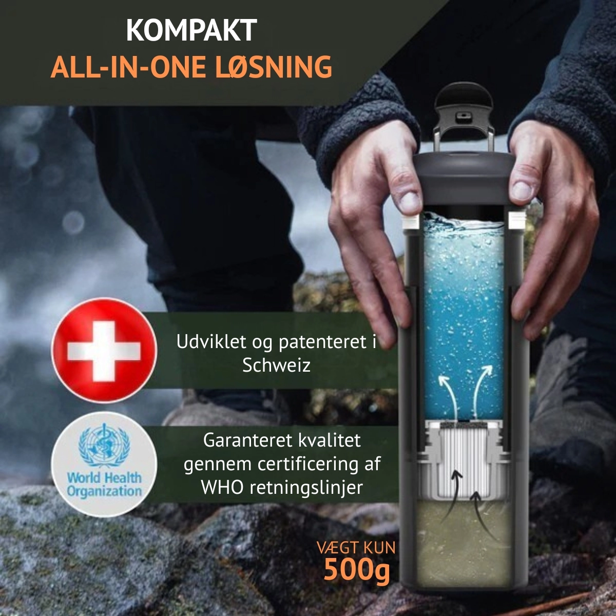 Vandfilterflaske og filtrering gjort enkelt. Nem all-in-one løsning. Renser 3,9 liter i minuttet og filtreret har en kapacitet på 1500 liter og 2500 cyklusser.