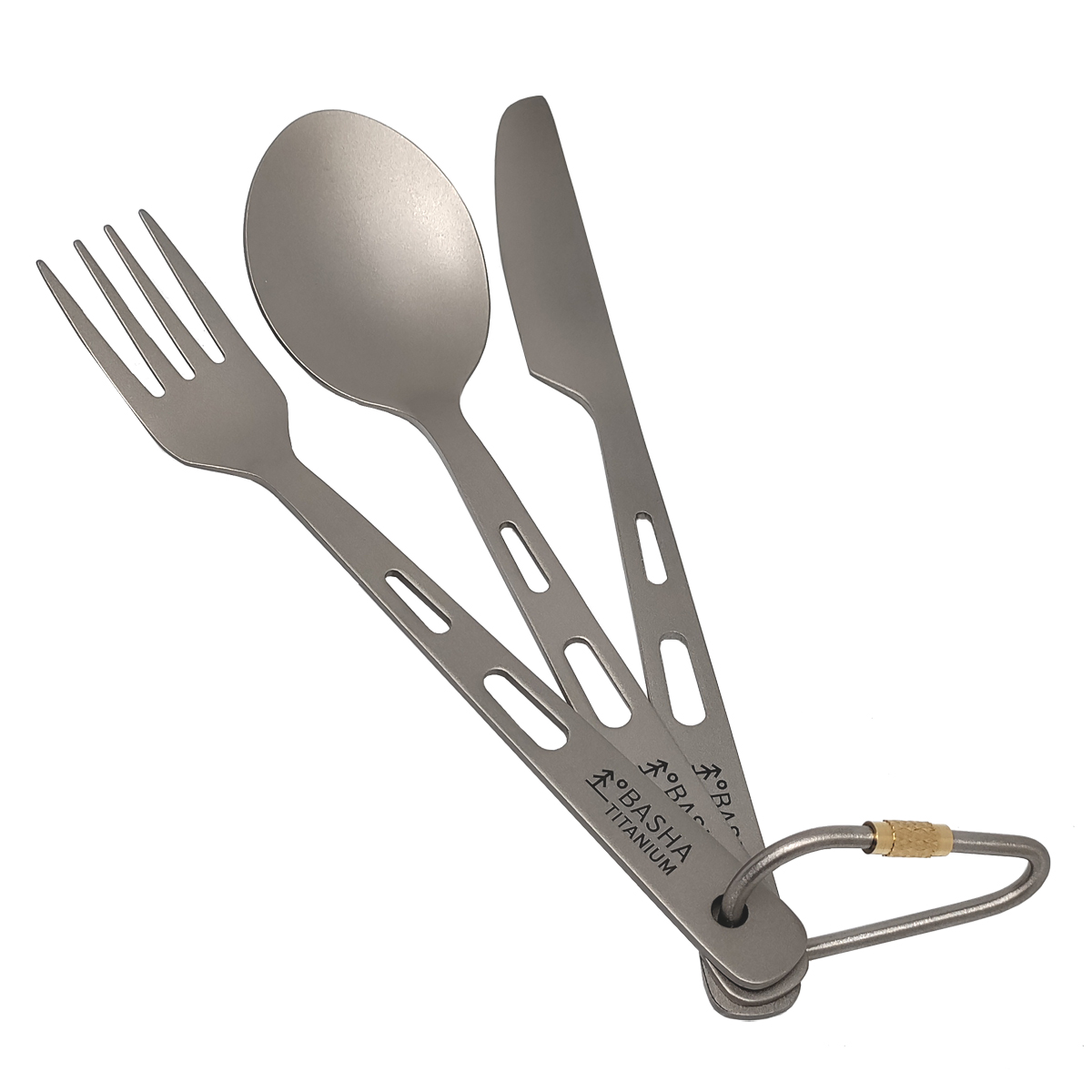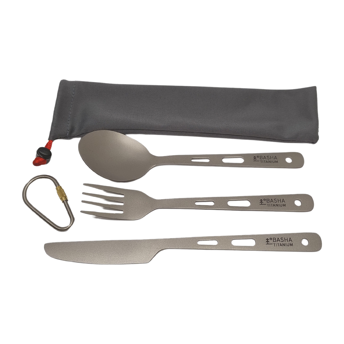 Basha HUNGR 3-delt bestiksæt i fuld størrelse er den ultimative praktiske løsning, der inkluderer en kniv, gaffel og ske, alle lavet af ekstremt slidstærkt og let titanium.