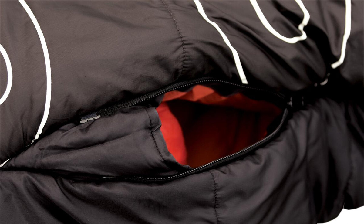 Soveposen er også udstyret med en anatomisk formet hætte, der holder hovedet varmt, og en isoleret åbningstunnel, som forhindrer varmetab. Højkvalitets YKK-lynlåse, udstyret med farvekodede snoretræk og en selvlysende ende, gør det nemt at justere lynlåsen, selv i mørke. Indvendigt finder du en praktisk mesh-lomme, perfekt til opbevaring af småting som en lommelygte, telefon eller andre nødvendigheder.