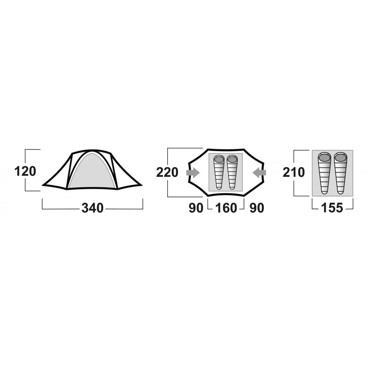 Med dimensionerne 220 × 340 × 120 cm tilbyder teltet masser af plads til to personer. Når det er pakket sammen, måler det kun 52 × 16 cm, hvilket gør det nemt at transportere. Teltet vejer mellem 3,8 og 4,2 kg, afhængig af den samlede oppakning. Konstruktionen består af stærke duraluminiumstænger med en diameter på 8,5 mm, der bidrager til teltets holdbarhed og stabilitet.